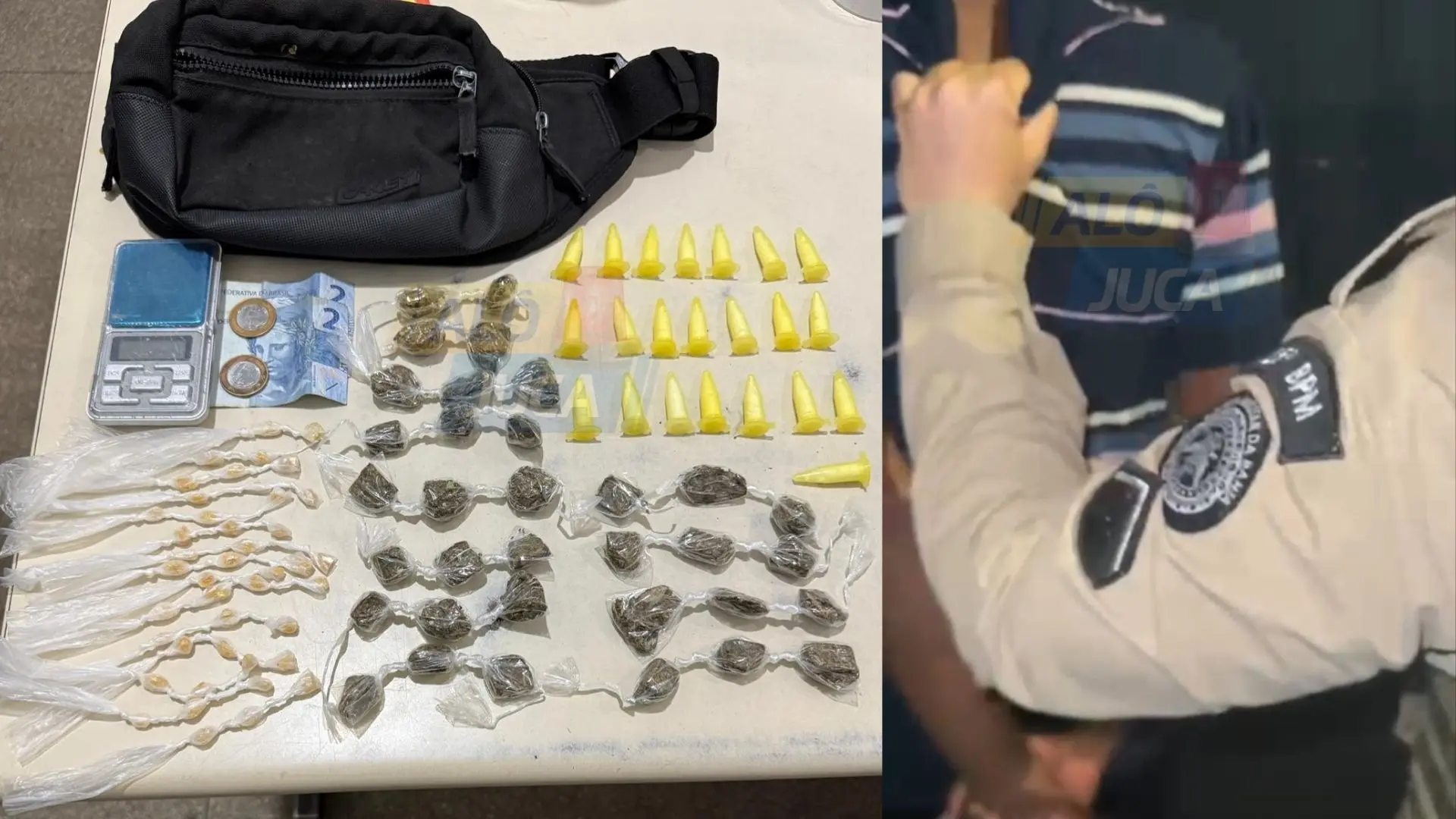 Com o adolescente, foram apreendidos 22 pinos grandes de material aparentando ser cocaína, 34 porções de erva semelhante à maconha e 43 pedras de crack. O material incluía ainda uma balança de precisão e R$ 6,00 em espécie. Após a apreensão, “Maxtil” foi conduzido à 20ª Delegacia Territorial (DT).
