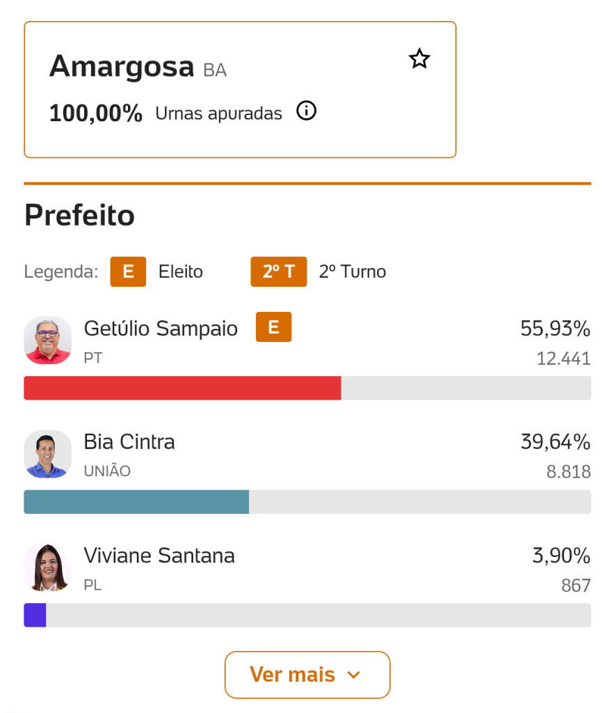 Qualquer neófito político ou eleitor desinformado eram sabedores que a eleição em Amargosa é polarizada entre o prefeito Júlio Pinheiro (PT) que elegeu seu sucessor, Getúlio Sampaio (PT), com 55,93% (12.441 votos), contra Bia Cintra (União Brasil), indicado do deputado federal Dal Barreto (União Brasil), que chegou a 39,63% (8.818 votos).