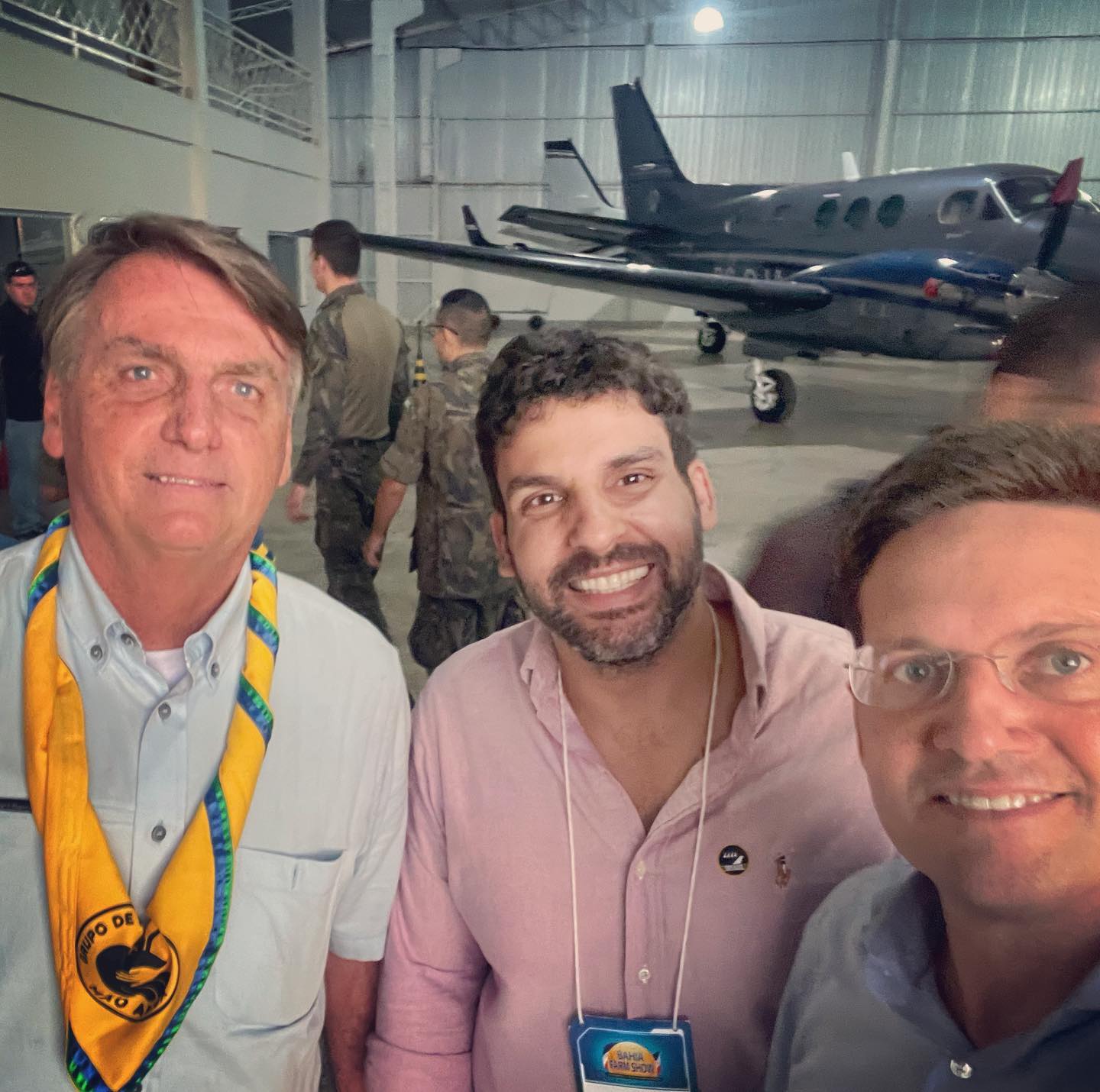 Ao desembarcar no aeroporto para participar da BAHIA FARM SHOW, a maior Feira de Agronegócio do Estado, Jair Bolsonaro foi ovacionado nas ruas pela população que acompanhou uma carreata que misturava os eleitores comuns e as autoridades apoiadoras do governo, em destaque João Roma, ex-ministro da Cidadania e o Capitão André Porciuncula, ex-secretário nacional da SEFIC, ambos missionados pelo Presidente da República para concorrerem a Governador e Deputado Federal pela Bahia, respectivamente.