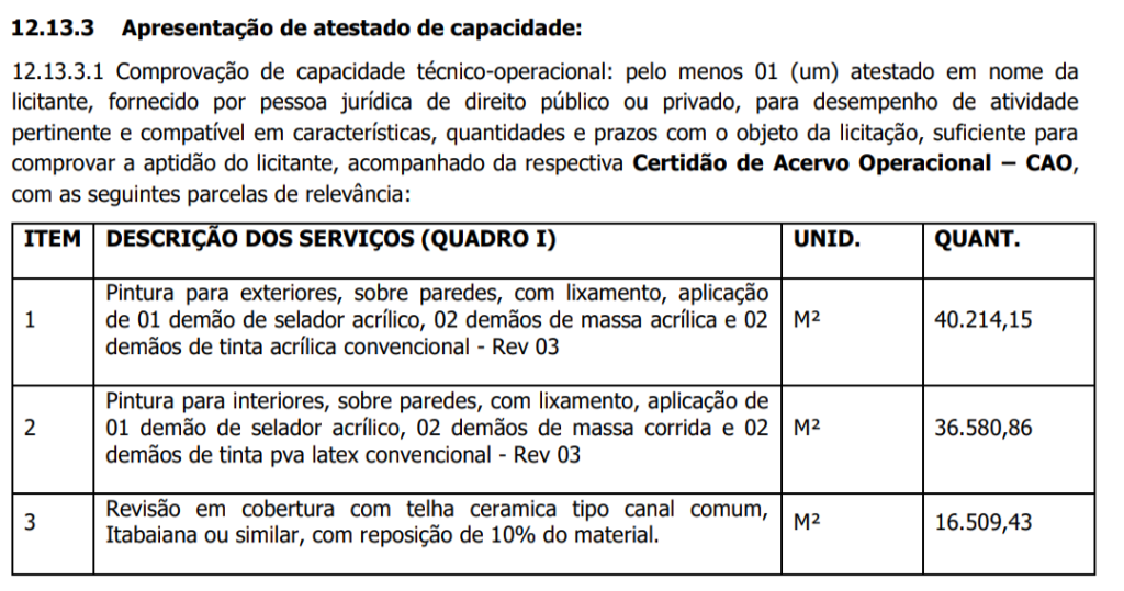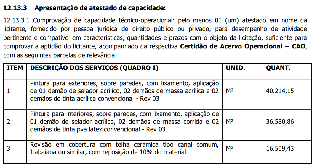 Pois bem, no edital do certame, um item chamou atenção de alguns participantes: 12.13.3.1 sobre o Atestado de Capacidade Técnica-Operacional, onde exige mais de 40 mil em pinturas para exteriores, ferindo o princípio da competitividade. O que não é normal.