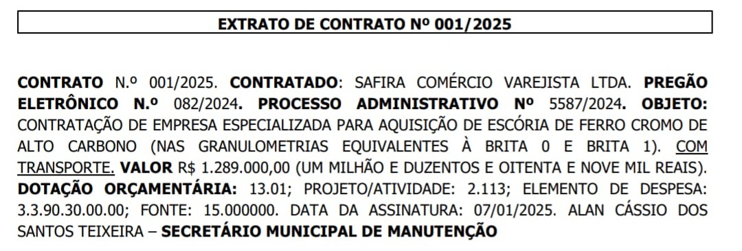 A empresa Safira Comércio Varejista Ltda., com sede na Praça Tiradentes, n° 19, em Candeias, ganhou uma licitação para fornecimento de Escória de Ferro Cromo com Alto Carbono, no valor de R$ 1.289.000,00.