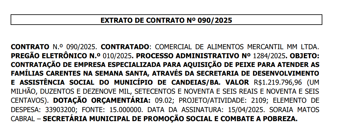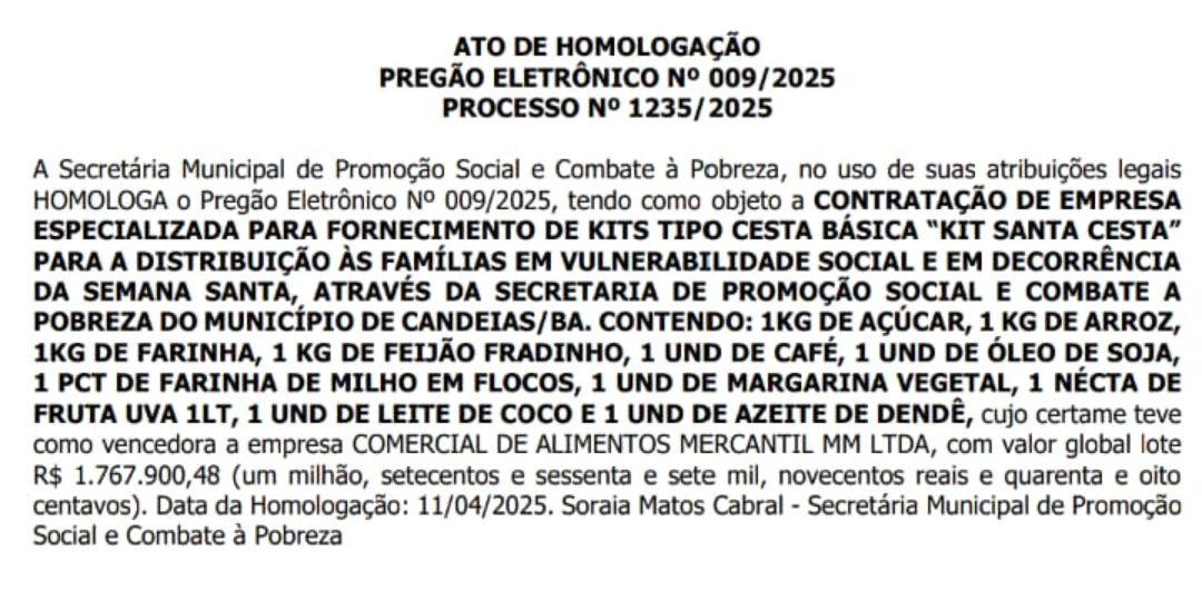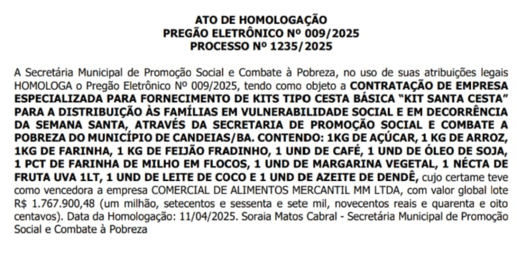 O prefeito de Candeias, Eriton Ramos (PP), como de praxe, direcionou duas licitações para a empresa Comercial de Alimentos Mercantil MM Ltda., que tem como proprietário William do Carro Cheio, para fornecimento de peixes e o kit santa cesta durante o período da Semana Santa.