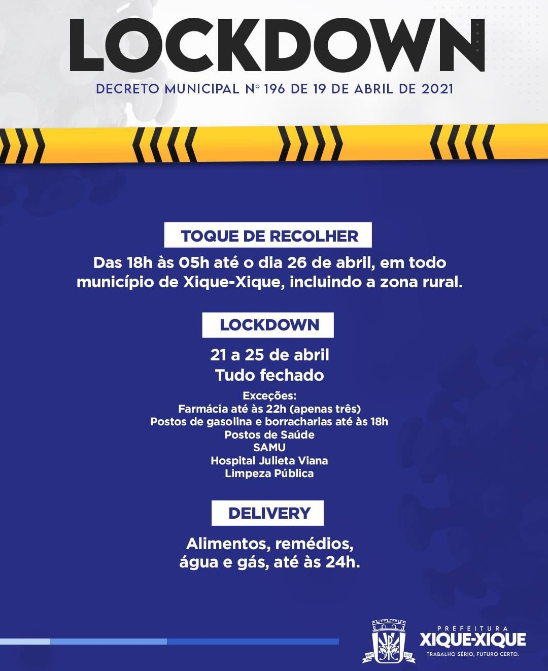 O prefeito do município de Xique-Xique, Reinaldinho (MDB), no interior da Bahia, decretou lockdown por 5 dias. Tudo fechado a partir desta quarta (21) até o próximo domingo (25), com exceção apenas farmácia, posto de gasolina, borracharia, SAMU e Hospital.