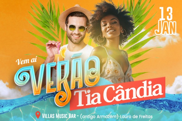 O portal de notícias Tia Cândia lança mais um projeto na área de entretenimento: VERÃO TIA CÂNDIA. O evento vai acontecer no dia 13 de janeiro de 2024, no VILLAS MUSIC BAR — antigo Armazém –, localizado na Av. Luis Tarquínio Pontes, em Lauro de Freitas.