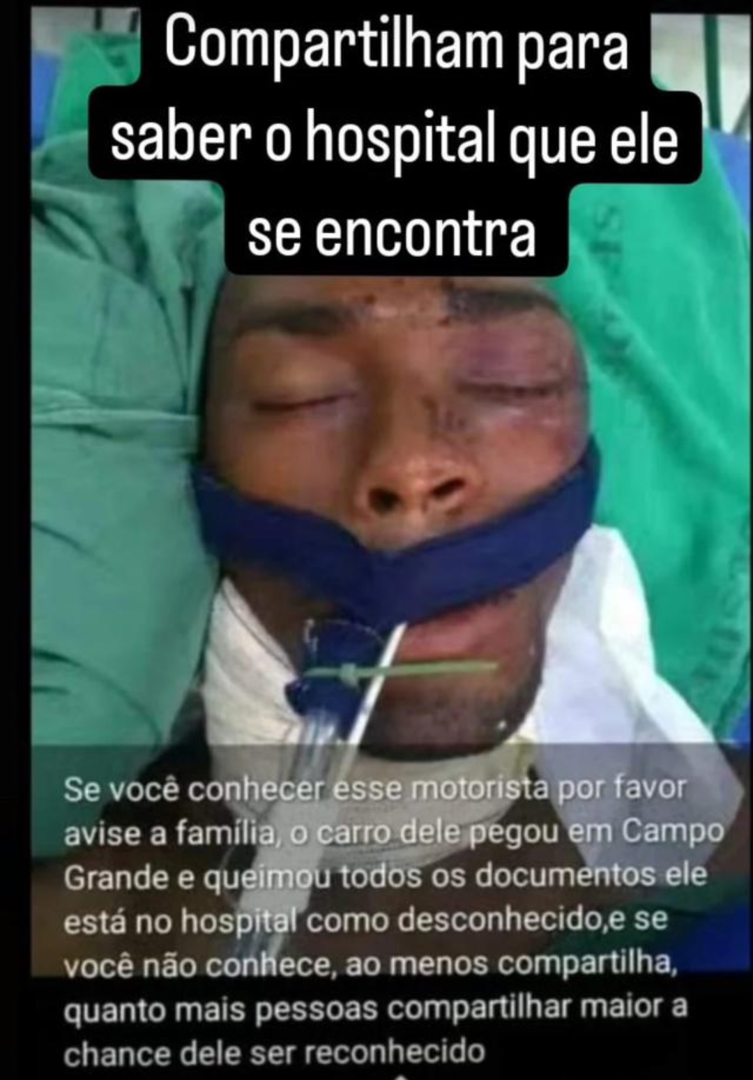 Circula uma foto nas redes sociais de um jovem hospitalizado em um hospital, sem identificação, e a família tenta localizar essa unidade de saúde para saber de fato se é o familiar, pela semelhança na foto.