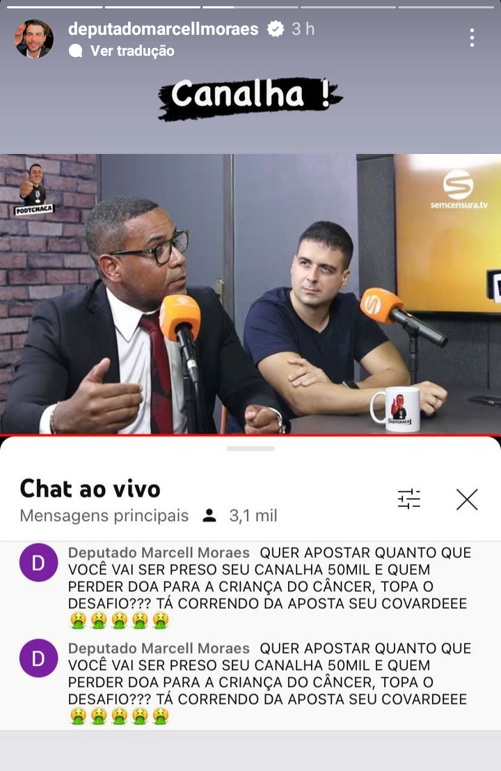 Logo em seguida, o seu desafeto, o ex-deputado estadual Marcell Moraes, foi nos comentários do chat ao vivo do podcast no youtube e desafiou o repórter: