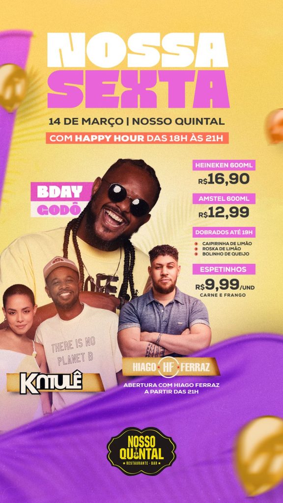 Bar e Restaurante Nosso Quintal apresenta nesta sexta-feira (14), a banda de samba Katulê e Hiago Ferraz, que abre o evento a partir das 21h, com happy hour das 18h às 21h.