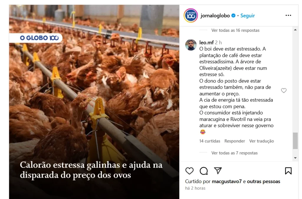 Uma reportagem publicada pelo O Globo nesta terça-feira (18) diz que o calorão estressa as galinhas e faz com que o preço dos ovos fique mais caro no Brasil. Nos comentários da publicação nas redes sociais, muitos internautas criticaram a notícia e até o pastor Silas Malafaia reagiu.