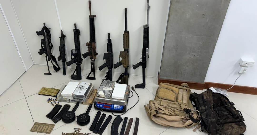 Os trabalhos começaram na noite desta quinta-feira (11) e concluída na madrugada desta sexta (12). Investigações apontavam que armas e drogas poderiam estar escondidas em áreas de difícil acesso. No buraco do bunker, os policiais encontraram seis fuzis, uma metralhadora, mais de mil munições, 10 kg de pasta base de cocaína, além de dois coletes à prova de balas.
