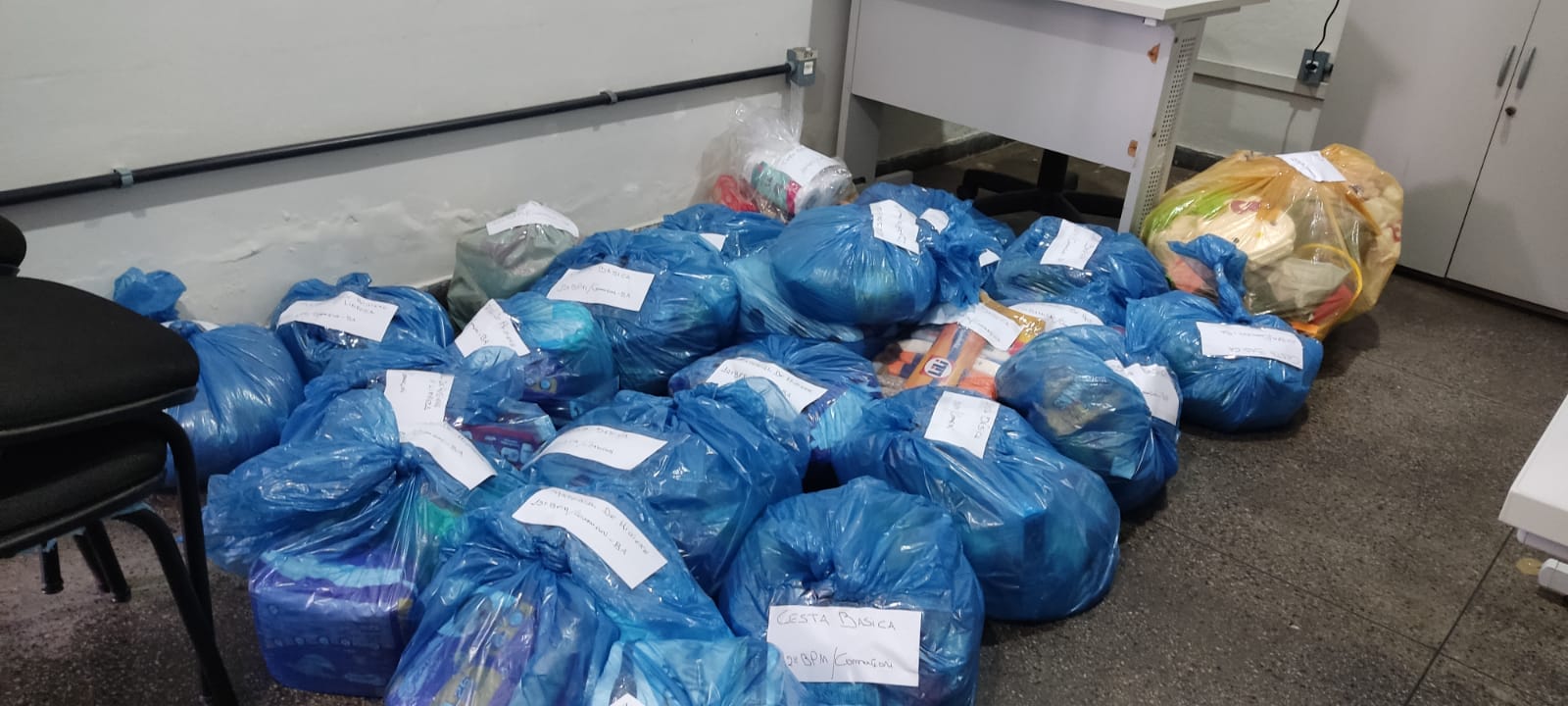 No total, o 12º Batalhão reuniu 14 cestas básicas, 09 kits de higiene e limpeza, além de cerca de 60 kg em roupas masculinas, femininas, infantis e roupas de cama.