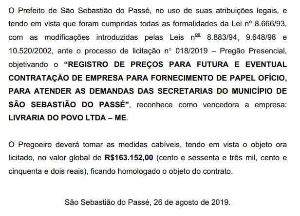 Pois bem: a empresa LIVRARIA DO POVO LTDA, do município de Candeias, foi a ganhadora do certame no valor de R$ 163.152,00 para o fornecimento de papel oficio. Será que na cidade de São Sebastião do Passé não tem nenhuma livraria de pequeno, médio ou grande porte para fornecer esse material com um valor mais em conta?