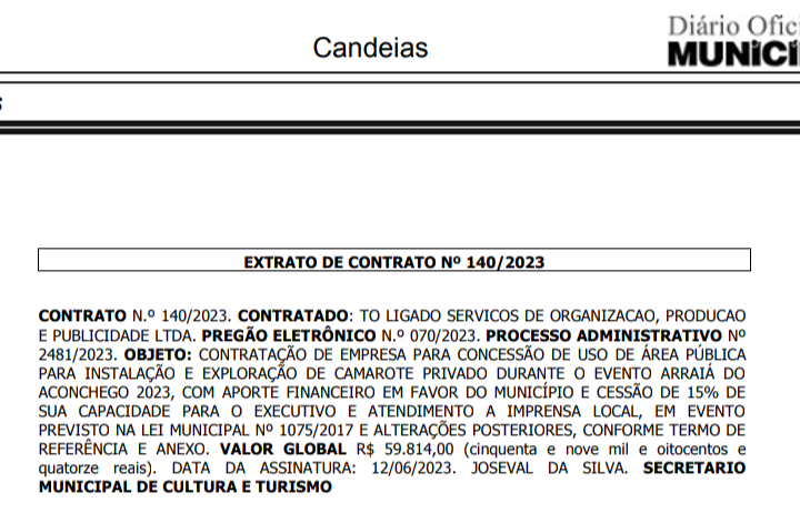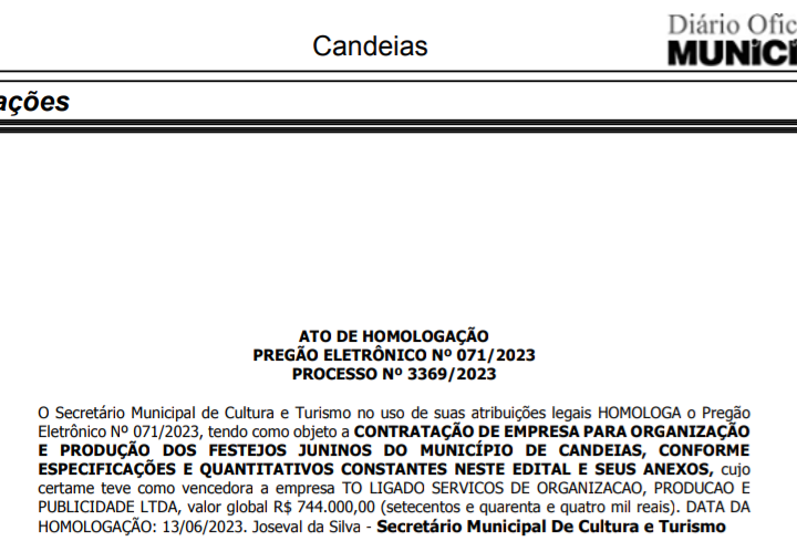 Como se não bastasse mais de R$ 3,5 milhões em atrações e mais de R$ 1,5 milhão com ornamentação, montagem e desmontagem de palco, iluminação e etc, o prefeito de Candeias, Dr. Pitágoras (PP), coçou o bolso público para organização e produção do Arraiá do Aconchego no valor de R$ 744 mil. A ganhadora do certame foi a empresa Tô Ligado Serviços e Organização Produção e Publicidade Ltda. O contrato foi publicado no Diário Oficial do Município nesta quinta, 15.