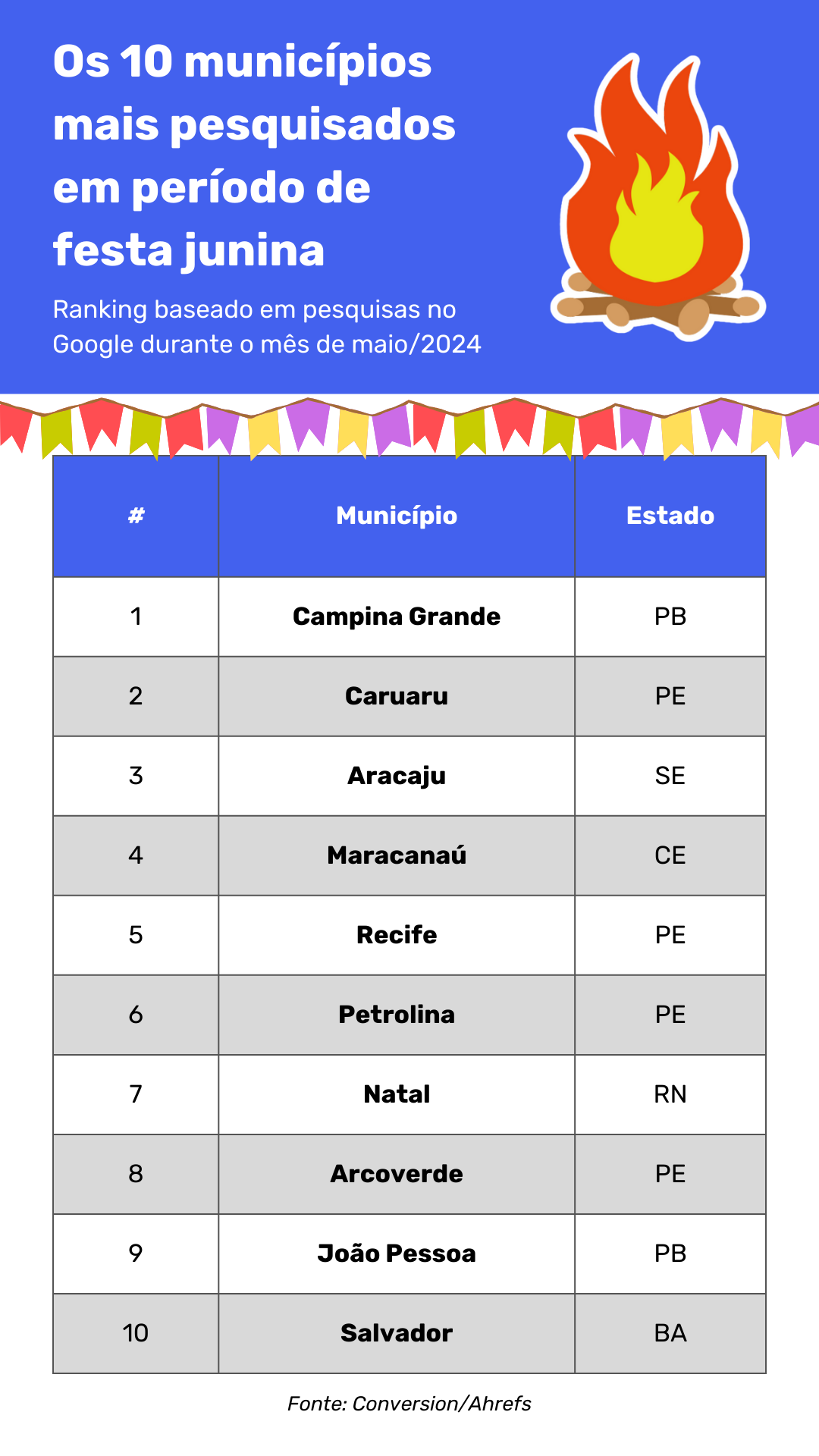Liderando a lista, está Campina Grande (PB), conhecida por ser a cidade com o “Maior São João do Mundo”. Realizada entre 29 de maio e 30 de junho, no Parque do Povo, a celebração conta com shows de grandes artistas, quadrilhas juninas, comidas típicas e diversas atividades culturais. Caruaru (PE), Aracaju (SE), Maracanaú (CE), Recife (PE), Petrolina (PE), Natal (RN), Arcoverde (PE) e João Pessoa (PB) preenchem as demais posições, respectivamente.