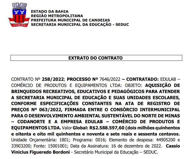 Dentre diversos contratos superfaturados perpetrados pela pasta, como por exemplo, o de R$ 5,6 milhões para aquisição de carnes e ovos para merenda escolar, o Secretário fez um para compra de “tablets” no valor de R$ 9.425.640,00 e mais de R$ 4,3 milhões para brinquedos: um no valor de R$ 2.588,597,60 e outro R$ 798.600,00.