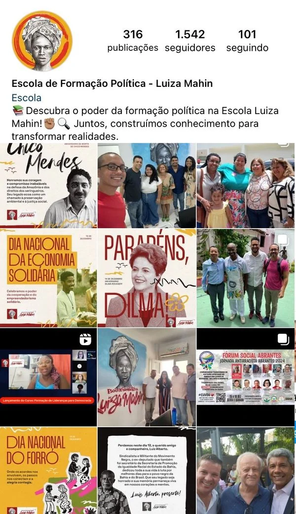 De acordo com a denúncia, a docente, que ainda seria filiada ao PT, elaborou e apresentou, no ano passado, à Escola de Administração da Ufba um curso de “Formação de Lideranças para a Democracia”. O projeto é desenvolvido em parceria com a Escola Luiza Mahin, que nunca existiu formalmente, e, no Instagram, tem sido uma plataforma de divulgação do PT. Nesta rede social, há mensagens de parabenização, por exemplo, ao governador Jerônimo Rodrigues, a ex-presidente Dilma Rousseff e trechos de palestras de deputados estaduais, como Robinson Almeida e Marcelino Galo.